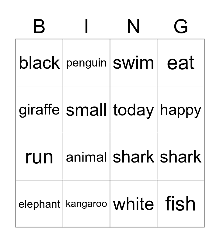 This bingo card has 16 words: kangaroo, shark, swim, black, run, penguin, shark, white, giraffe, small, elephant, eat, animal, happy, today and fish.