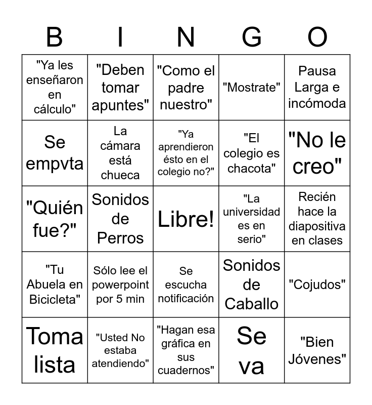 This bingo card has a free space and 24 words: Sólo lee el powerpoint por 5 min, "Usted No estaba atendiendo", "Ya aprendieron ésto en el colegio no?", Toma lista, Pausa Larga e incómoda, "Ya les enseñaron en cálculo", Se empvta, "Deben tomar apuntes", "La universidad es en serio", Se escucha notificación, "El colegio es chacota", "Quién fue?", Sonidos de Caballo, "Cojudos", La cámara está chueca, Se va, Recién hace la diapositiva en clases, "Como el padre nuestro", "No le creo", Sonidos de Perros, "Bien Jóvenes", "Tu Abuela en Bicicleta", "Mostrate" and "Hagan esa gráfica en sus cuadernos".