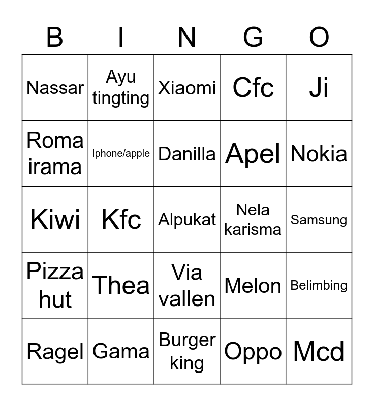 This bingo card has a free space and 24 words: Thea, Gama, Danilla, Ragel, Ji, Nassar, Roma irama, Ayu tingting, Nela karisma, Via vallen, Apel, Kiwi, Melon, Belimbing, Iphone/apple, Oppo, Samsung, Xiaomi, Nokia, Kfc, Mcd, Pizza hut, Cfc and Burger king.