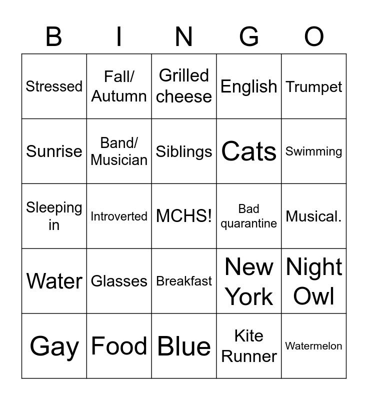 This bingo card has a free space and 24 words: Gay, Glasses, Siblings, Kite Runner, Trumpet, Stressed, Fall/ Autumn, Grilled cheese, Bad quarantine, Musical., Sleeping in, Band/ Musician, New York, Night Owl, Sunrise, Food, Blue, English, Swimming, Water, Introverted, Breakfast, Cats and Watermelon.