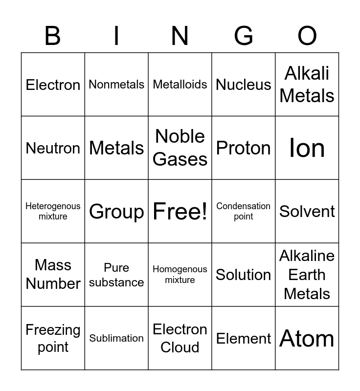 This bingo card has a free space and 32 words: Element, Period, Group, Atomic Number, Mass Number, Metals, Alkali Metals, Alkaline Earth Metals, Nonmetals, Halogens, Noble Gases, Metalloids, Boiling point, Compound, Condensation point, Evaporation, Freezing point, Heterogenous mixture, Homogenous mixture, Pure substance, Solution, Solute, Solvent, Sublimation, Atom, Nucleus, Proton, Neutron, Electron, Electron Cloud, Isotope and Ion.
