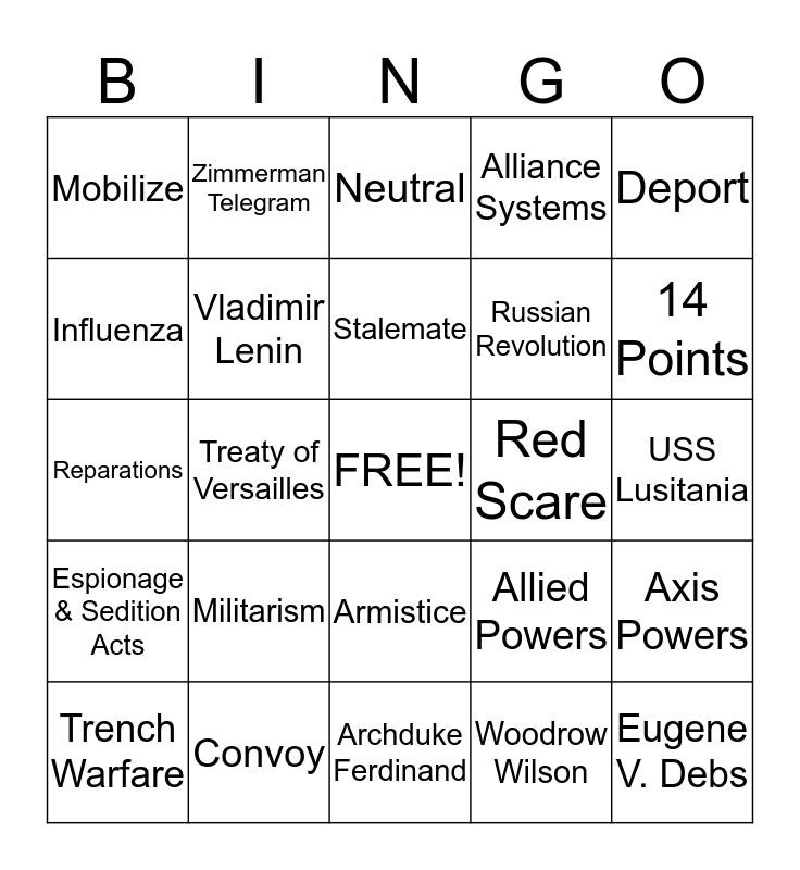 This bingo card has a free space and 24 words: Militarism, Convoy, Stalemate, Trench Warfare, Deport, Mobilize, Influenza, Zimmerman Telegram, Red Scare, Armistice, Russian Revolution, Reparations, Allied Powers, Axis Powers, Vladimir Lenin, Woodrow Wilson, USS Lusitania, Neutral, 14 Points, Treaty of Versailles, Eugene V. Debs, Espionage & Sedition Acts, Alliance Systems and Archduke Ferdinand.