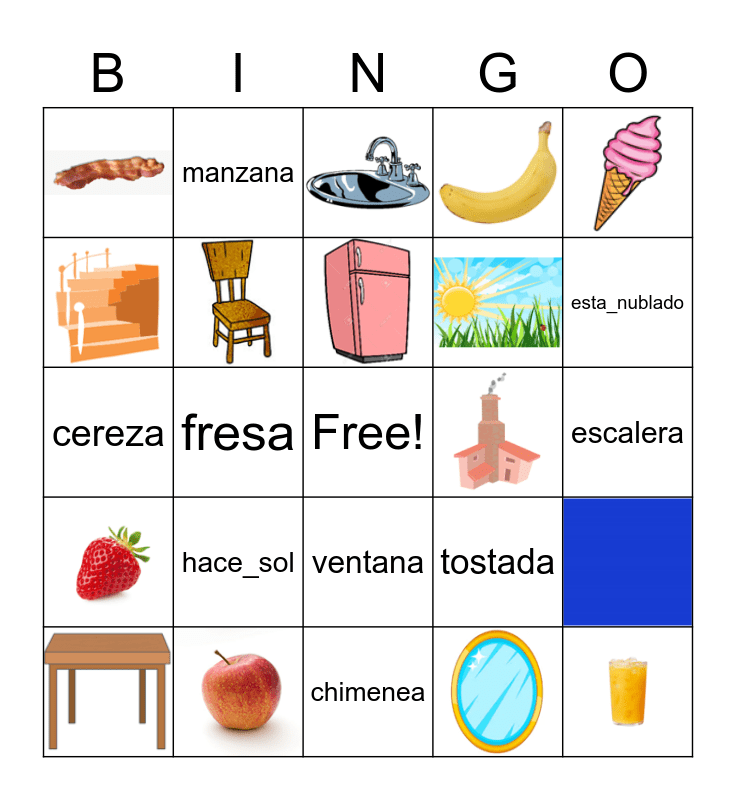 This bingo card has 31 images, a free space and 31 words: puerta, silla, nevera, escalera, manzana, guineo, naranja, fresa, uva, cereza, hace_viento, hace_sol, esta_lloviendo, esta_nublado, tostada, galletas, tocino, jugo, helado, ventana, chimenea, lavadero, mesa, espejo, ducha, sofa, cama, lampara, azul, rojo and naranja.