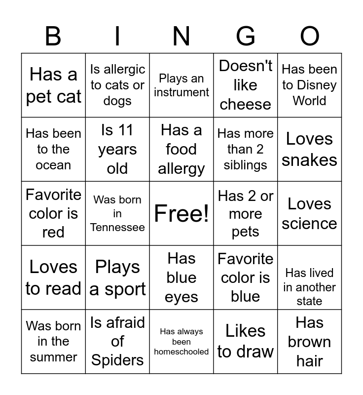 This bingo card has a free space and 28 words: Has lived in another state, Has been on a plane, Has more than 2 siblings, Likes to draw, Has been to the ocean, Plays an instrument, Is allergic to cats or dogs, Loves to read, Has 2 or more pets, Was born in the summer, Favorite color is red, Doesn't like cheese, Is afraid of Spiders, Has always been homeschooled, Loves snakes, Has no pets, Plays a sport, Is 11 years old, Has a food allergy, Has blue eyes, Has a pet cat, Is an only child, Has brown hair, Was born in Tennessee, Loves science, Favorite color is blue, Has been to Disney World and Does not live in Columbia.