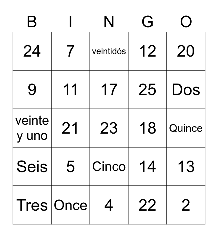 This bingo card has a free space and 49 words: 1, 2, 3, 4, 5, 6, 7, 8, 9, 10, 11, 12, 13, 14, 15, 16, 17, 18, 19, 20, 21, 22, 24, 25, Uno, Dos, Tres, Quatro, Cinco, Seis, Siete, Ocho, Nueve, Diez, Once, Doce, Trece, Catorce, Quince, Dieciséis, Diecisiete, Dieciocho, Diecinueve, vente, veinte y uno, veintidós, veintitrés, Veinticuatro and Veinticinco.