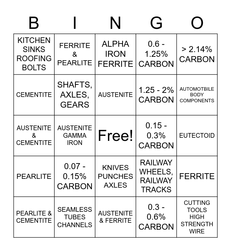 This bingo card has a free space and 24 words: 0.07 - 0.15% CARBON, SEAMLESS TUBES CHANNELS, AUSTENITE, PEARLITE & CEMENTITE, > 2.14% CARBON, KITCHEN SINKS ROOFING BOLTS, CEMENTITE, FERRITE & PEARLITE, 0.15 - 0.3% CARBON, KNIVES PUNCHES AXLES, 1.25 - 2% CARBON, AUSTENITE & CEMENTITE, RAILWAY WHEELS, RAILWAY TRACKS, FERRITE, SHAFTS, AXLES, GEARS, 0.3 - 0.6% CARBON, EUTECTOID, ALPHA IRON FERRITE, AUTOMOTBILE BODY COMPONENTS, AUSTENITE GAMMA IRON, CUTTING TOOLS HIGH STRENGTH WIRE, PEARLITE, 0.6 - 1.25% CARBON and AUSTENITE & FERRITE.