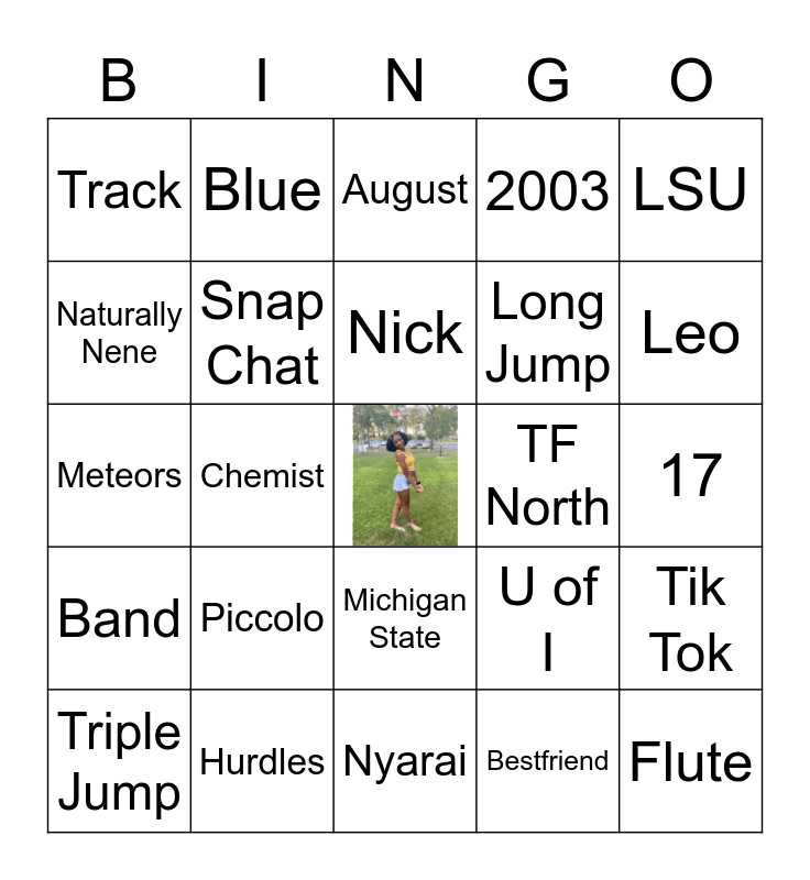 This bingo card has a free space and 24 words: Piccolo, Hurdles, Nick, Triple Jump, LSU, Track, Naturally Nene, Blue, TF North, Michigan State, Long Jump, Meteors, U of I, Tik Tok, Snap Chat, Bestfriend, 17, August, Leo, Chemist, Flute, Band, 2003 and Nyarai.