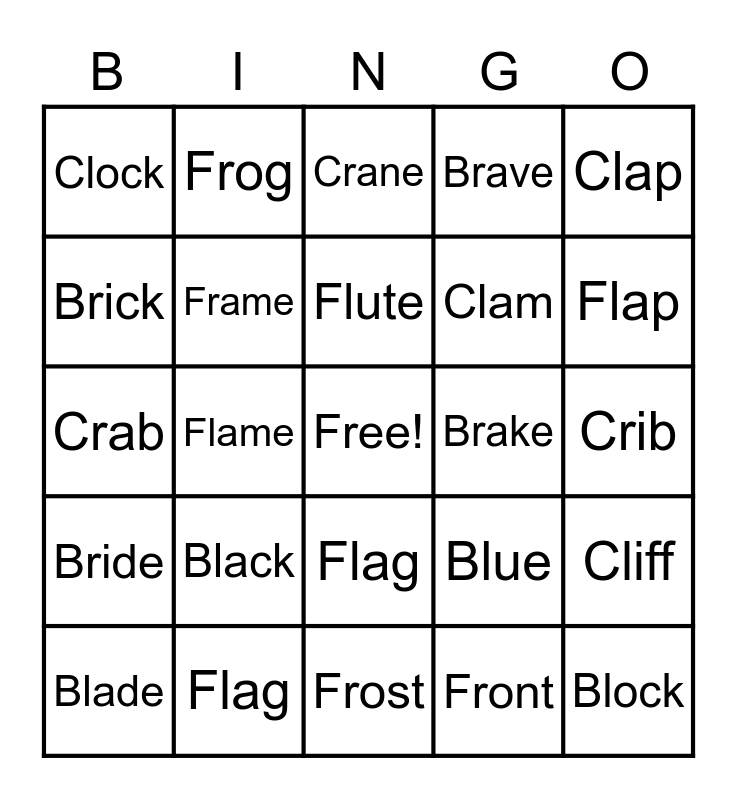 This bingo card has a free space and 24 words: Black, Flag, Flute, Blade, Clap, Clock, Brick, Frog, Brake, Flag, Clam, Crab, Blue, Cliff, Frame, Front, Crib, Crane, Flap, Flame, Block, Bride, Brave and Frost.