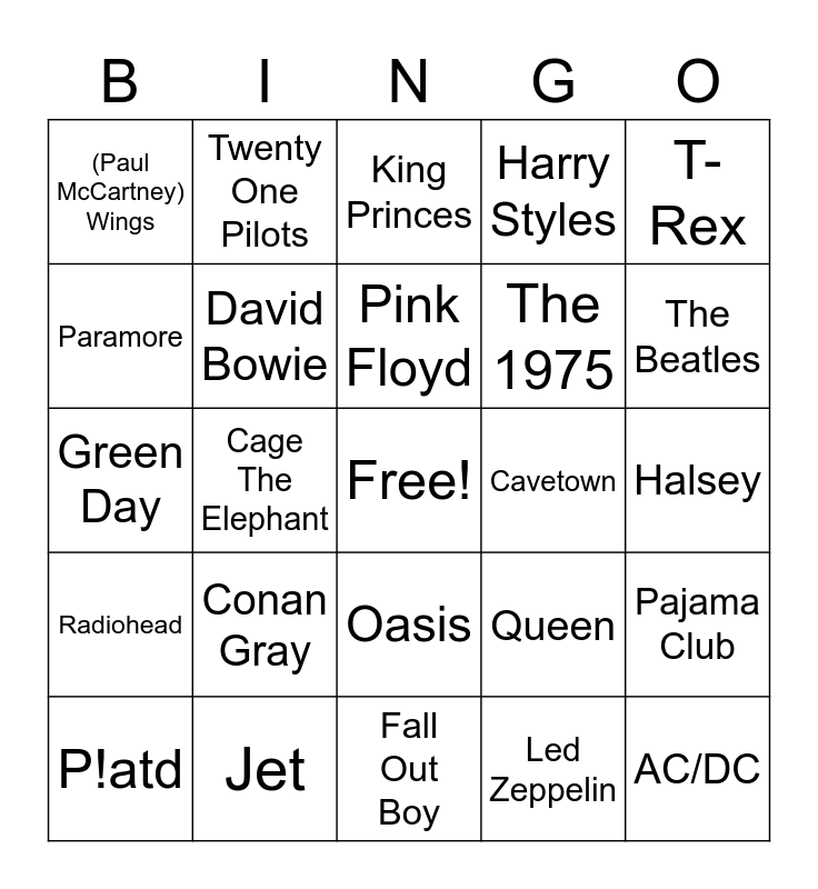 This bingo card has a free space and 32 words: Led Zeppelin, Waterparks, Cage The Elephant, Wheatus, Radiohead, David Bowie, T-Rex, Pajama Club, Twenty One Pilots, The Killers, Pink Floyd, King Princes, The Wrecks, Weezer, Cavetown, MCR, P!atd, Green Day, Oasis, Conan Gray, Queen, Girl in red, Halsey, Jet, AC/DC, Harry Styles, The 1975, Paramore, (Paul McCartney) Wings, Fall Out Boy, Sody and The Beatles.