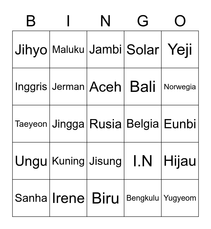 This bingo card has a free space and 24 words: Kuning, Irene, Aceh, Sanha, Yeji, Jihyo, Inggris, Maluku, Belgia, Jisung, Bali, Taeyeon, I.N, Hijau, Jerman, Bengkulu, Eunbi, Jambi, Norwegia, Jingga, Yugyeom, Ungu, Solar and Biru.