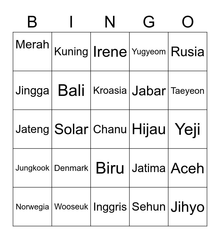 This bingo card has 25 words: Denmark, Inggris, Kroasia, Norwegia, Rusia, Merah, Jingga, Kuning, Hijau, Biru, Jabar, Jateng, Jatima, Aceh, Bali, Jihyo, Yeji, Irene, Taeyeon, Solar, Chanu, Wooseuk, Jungkook, Yugyeom and Sehun.