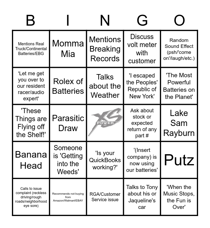 This bingo card has a free space and 24 words: Someone is 'Getting into the Weeds', Recommends not buying from Amazon/Walmart/EBAY, Talks about the Weather, Calls to issue complaint (reckless driving/rough roads/neighborhood eye sore), Random Sound Effect (psh/'come on'/laugh/etc.), Mentions Real Truck/Continental Batteries/EBG, 'Let me get you over to our resident racer/audio expert', Momma Mia, Ask about stock or expected return of any part #, 'Is your QuickBooks working?', 'I escaped the Peoples' Republic of New York', 'These Things are Flying off the Shelf!', '(Insert company) is now using our batteries', Putz, Rolex of Batteries, Talks to Tony about his or Jaqueline's car, Lake Sam Rayburn, Mentions Breaking Records, 'The Most Powerful Batteries on the Planet', Parasitic Draw, 'When the Music Stops, the Fun is Over', Banana Head, Discuss volt meter with customer and RGA/Customer Service issue.