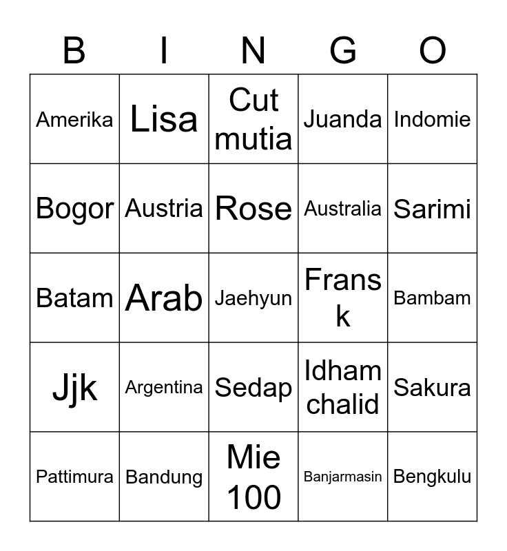 This bingo card has a free space and 24 words: Argentina, Bandung, Rose, Pattimura, Indomie, Amerika, Bogor, Lisa, Frans k, Sedap, Australia, Batam, Idham chalid, Sakura, Austria, Banjarmasin, Bambam, Cut mutia, Sarimi, Arab, Bengkulu, Jjk, Juanda and Mie 100.