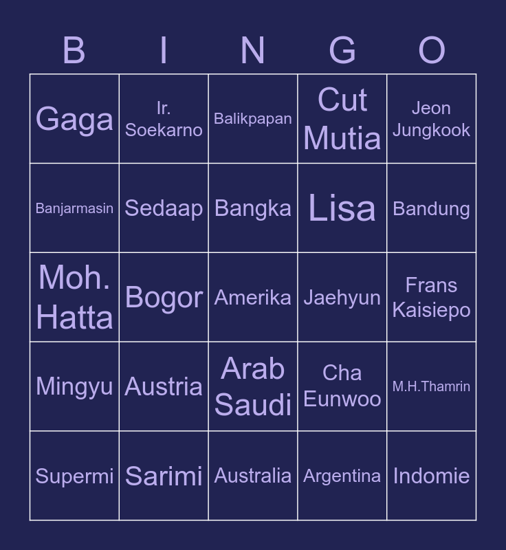This bingo card has a free space and 24 words: Austria, Sarimi, Bangka, Supermi, Jeon Jungkook, Gaga, Banjarmasin, Ir. Soekarno, Jaehyun, Arab Saudi, Lisa, Moh. Hatta, Cha Eunwoo, M.H.Thamrin, Sedaap, Argentina, Frans Kaisiepo, Balikpapan, Bandung, Bogor, Indomie, Mingyu, Cut Mutia and Australia.