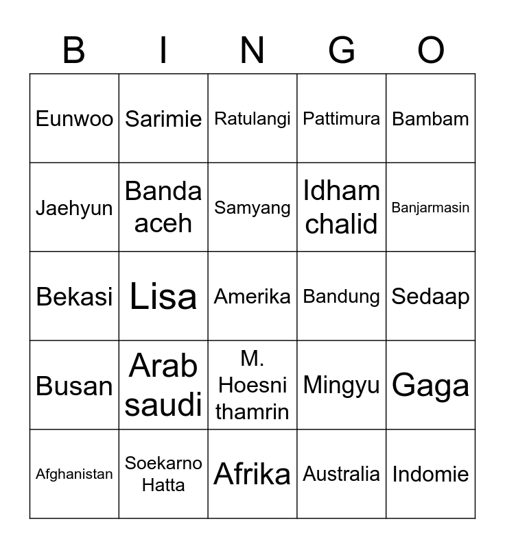 This bingo card has a free space and 24 words: Arab saudi, Soekarno Hatta, Samyang, Afghanistan, Bambam, Eunwoo, Jaehyun, Sarimie, Bandung, M. Hoesni thamrin, Idham chalid, Bekasi, Mingyu, Gaga, Banda aceh, Australia, Sedaap, Ratulangi, Banjarmasin, Lisa, Indomie, Busan, Pattimura and Afrika.