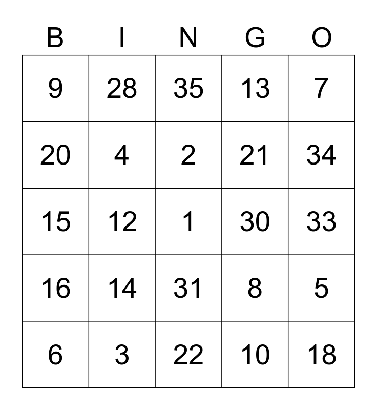This bingo card has 25 words: 14, 22, 2, 6, 7, 9, 20, 28, 30, 31, 21, 15, 8, 5, 4, 18, 33, 35, 34, 12, 1, 3, 16, 13 and 10.