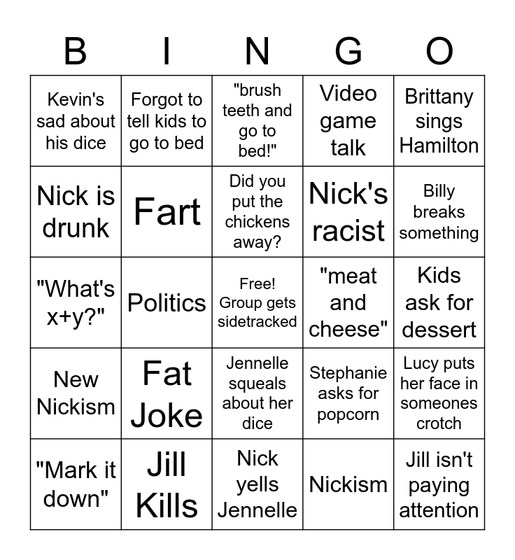 This bingo card has a free space and 24 words: Fat Joke, Jill Kills, Did you put the chickens away?, "Mark it down", Brittany sings Hamilton, Kevin's sad about his dice, Nick is drunk, Forgot to tell kids to go to bed, "meat and cheese", Jennelle squeals about her dice, Nick's racist, "What's x+y?", Stephanie asks for popcorn, Lucy puts her face in someones crotch, Fart, Nickism, Kids ask for dessert, "brush teeth and go to bed!", Billy breaks something, Politics, Jill isn't paying attention, New Nickism, Video game talk and Nick yells Jennelle.