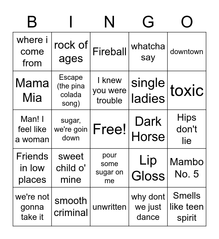 This bingo card has a free space and 173 words: i"ll make a man out of you, Timber, thank u, next, I want it that way, Hips don't lie, sweet dreams (are made of this), Eastside (Halsey & Khalid), I write sins not tragedies, Since U been gone, Fergalicious, Tik Tok, Bye Bye Bye, Man! I feel like a woman, Jumpin, Jumpin, Smells like teen spirit, I wanna dance with somebody, pour some sugar on me, Jessie's Girl, Don't Stop Believin, Africa, 9 to 5, Footloose, Livin' on a prayer, High hopes, Happier, Sunflower, Close to Me, Redbone, Despacito, Bamboleo, Wake Wake, September, Believer, All Night, Come and get your love, Forever, Wake me up, Gangsta's Paradise, Stronger, how far i'll go, Life is a Highway, Circle of Life, Under the Sea, The greatest show, party in the USA, Apologize, Dirt Road Anthem, Kiss Kiss, Every time we touch, yeah!, One, Two Step, umbrella, single ladies, before he cheats, payphone, swing, I don't want this night to end, song of the south, Take me home, country roads, the devil went down to Georgia, Friends in low places, where i come from, hillbilly bone, honky tonk badonkadonk, save a horse (ride a cowboy), the fresh prince of bel-air, 7 rings, taki taki, mi Gente, smooth criminal, poker face, uptown funk, downtown, body, sicko mode, pony, why dont we just dance, country girl, come hang out, location, galway girl, burnin' up, temperature, hey soul sister, homecoming, sweet home Alabama, Now and later, international love, teenage dream, rock of ages, juke box hero, rock you like a hurricane, summer of '69, Escape (the pina colada song), Lip Gloss, Fireball, welcome to the jungle, another one bites the dust, any way you want it, bown in the USA, walk this way, sweet child o' mine, barracude, we're not gonna take it, crazy train, little white church, God's plan, the middle, i like me better, red, lucid dreams, Finesse, MIA, All the stars, ..baby one more time, a thousand miles, genie in a bottle, Hey YA!, Lady Marmalade, Waterfalls, Don't stop the music, The Reason, It's my life, Mambo No. 5, Irreplaceable, Low, California Love, Seven Nation army, Cry me. river, This is how we do it, Thunder, Saturday Sun, It's not my time, Closer, dance, dance, sugar, we're goin down, dirty little secret, talk, tongue tied, Handclap, I knew you were trouble, Mine, Jolene, Wagon Wheel, That Don't impress me much, Chicken Fried, Dark Horse, Bohemian Rhapsody, Sk8er Boi, Dancing in the moonlight, Mama Mia, toxic, what makes you beautiful, fire burning, unwritten, hey there deliliah, love story, wannabe, dancing queen, we will rock you, whatcha say, blue (da be dee), Cheerleader, YMA, All summer long, Right Thur, Larger than life, 1985, The rubberband man, The Chain, Higher Love, Simple Man and Because the Night.
