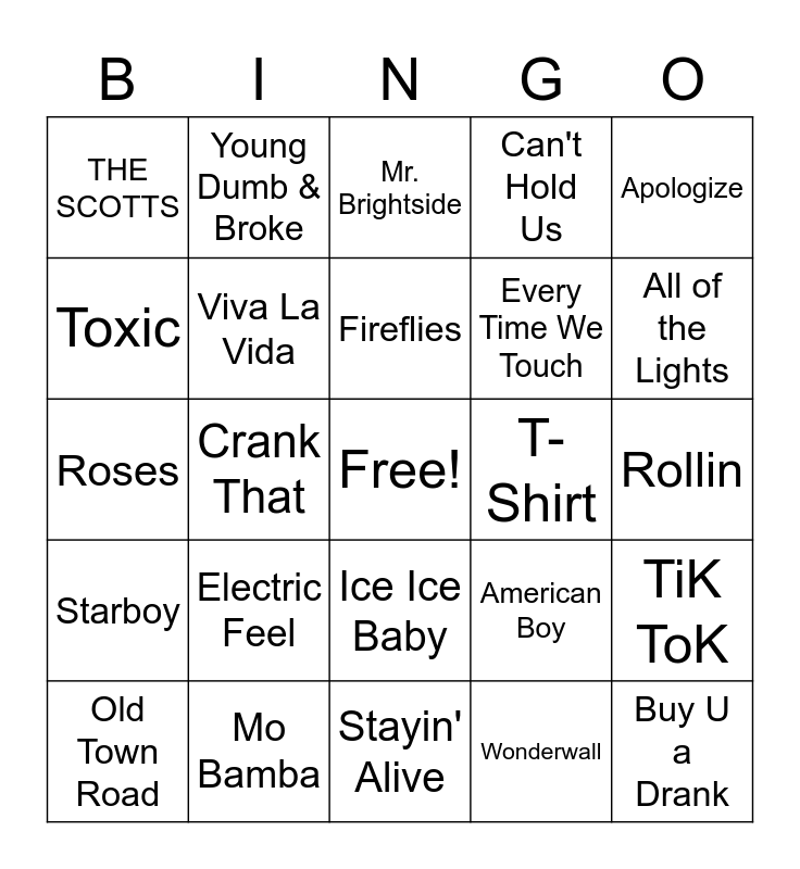 This bingo card has a free space and 24 words: Electric Feel, Mo Bamba, Fireflies, Old Town Road, Apologize, THE SCOTTS, Toxic, Young Dumb & Broke, T-Shirt, Ice Ice Baby, Every Time We Touch, Roses, American Boy, TiK ToK, Viva La Vida, Wonderwall, Rollin, Mr. Brightside, All of the Lights, Crank That, Buy U a Drank, Starboy, Can't Hold Us and Stayin' Alive.