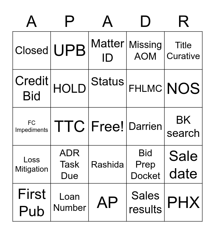 This bingo card has a free space and 24 words: ADR Task Due, Loan Number, Status, First Pub, Title Curative, Closed, Credit Bid, UPB, Darrien, Rashida, FHLMC, FC Impediments, Bid Prep Docket, Sale date, HOLD, Sales results, BK search, Matter ID, NOS, TTC, PHX, Loss Mitigation, Missing AOM and AP.