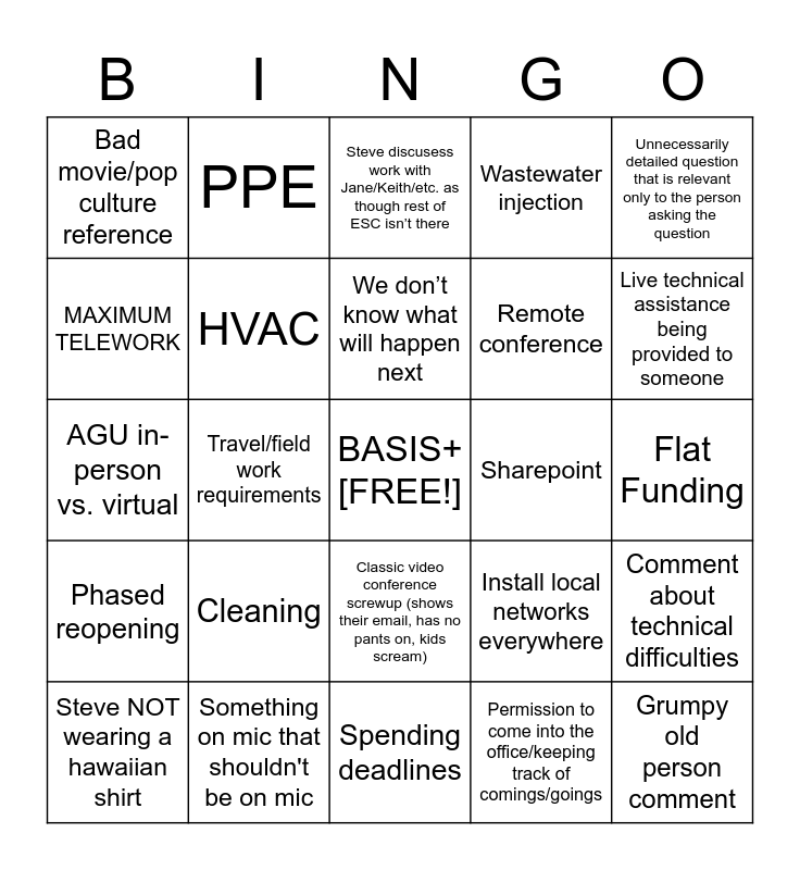 This bingo card has a free space and 42 words: We’re working on it, We don’t know what will happen next, We are making plans, Cleaning, Permission to come into the office/keeping track of comings/goings, Comment about technical difficulties, Grumpy old person comment, Speaker talks about MP/MF and forgets there are other offices, Steve discusess work with Jane/Keith/etc. as though rest of ESC isn’t there, Classic video conference screwup (shows their email, has no pants on, kids scream), Flat Funding, Live technical assistance being provided to someone, Travel/field work requirements, Unnecessarily detailed question that is relevant only to the person asking the question, We’re so productive [despite pandemic, despite flat funding, despite smaller workforce], Install local networks everywhere, Microseismicity is important, AGU in-person vs. virtual, Speaker coughs and then swears it’s not the ‘rona, PPE, MAXIMUM TELEWORK, MAX TELEWORK Hat Trick (3x), There will be a worksheet for that, Bad movie/pop culture reference, Teams failure, Carry-over, Remote conference, These are tough times, Zoom burnout, Office reoccupation/return to normal, Health/self assessment, Phased reopening, HVAC, Spending deadlines, Pets on screen, Steve NOT wearing a hawaiian shirt, Something on mic that shouldn't be on mic, Sharepoint, EarthMAP, Refers people to email or meeting notes, Wastewater injection and Superdense array.