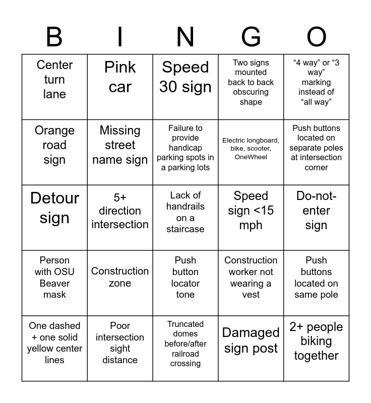 This bingo card has a free space and 24 words: Construction zone, Poor intersection sight distance, Failure to provide handicap parking spots in a parking lots, One dashed + one solid yellow center lines, “4 way” or “3 way” marking instead of “all way”, Center turn lane, Orange road sign, Pink car, Speed sign <15 mph, Push button locator tone, Electric longboard, bike, scooter, OneWheel, Detour sign, Construction worker not wearing a vest, Push buttons located on same pole, Missing street name sign, Damaged sign post, Do-not-enter sign, Speed 30 sign, Push buttons located on separate poles at intersection corner, 5+ direction intersection, 2+ people biking together, Person with OSU Beaver mask, Two signs mounted back to back obscuring shape and Truncated domes before/after railroad crossing.