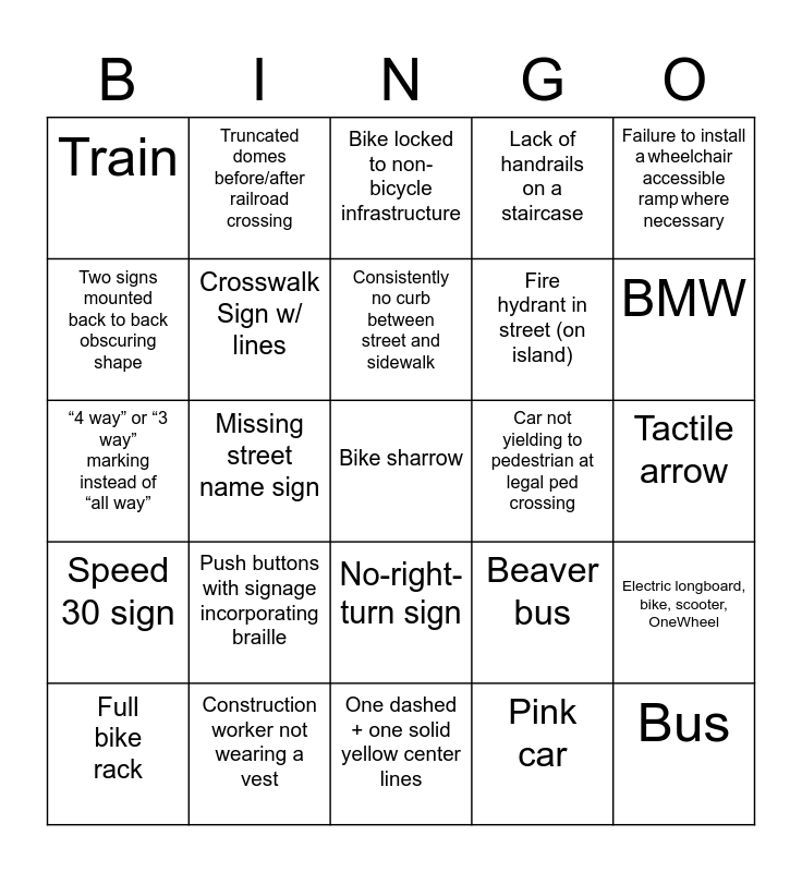 This bingo card has a free space and 24 words: Push buttons with signage incorporating braille, Construction worker not wearing a vest, Consistently no curb between street and sidewalk, Full bike rack, Failure to install a wheelchair accessible ramp where necessary, Train, Two signs mounted back to back obscuring shape, Truncated domes before/after railroad crossing, Car not yielding to pedestrian at legal ped crossing, No-right-turn sign, Fire hydrant in street (on island), “4 way” or “3 way” marking instead of “all way”, Beaver bus, Electric longboard, bike, scooter, OneWheel, Crosswalk Sign w/ lines, Pink car, Tactile arrow, Bike locked to non-bicycle infrastructure, BMW, Missing street name sign, Bus, Speed 30 sign, Lack of handrails on a staircase and One dashed + one solid yellow center lines.