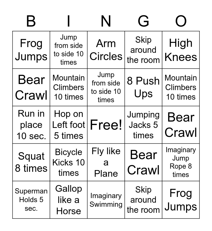This bingo card has a free space and 100 words: Jumping Jacks 5 times, High Knees, Bear Crawl, Plank 10 sec., Hop on Right foot 5 times, Hop on Left foot 5 times, Frog Jumps, Chicken Dance, Fly like a Plane, Skip around the room, Jump from side to side 10 times, Imaginary Jump Rope 8 times, Walk like an Astronaut on the Moon, Gallop like a Horse, Squat 8 times, 10 Crunches, 8 Push Ups, Run in place 10 sec., Superman Holds 5 sec., Mountain Climbers 10 times, Arm Circles, Bicycle Kicks 10 times, Dance like a Monkey, Tip Toe around the Room, Imaginary Swimming, Jumping Jacks 5 times, High Knees, Bear Crawl, Plank 10 sec., Hop on Right foot 5 times, Hop on Left foot 5 times, Frog Jumps, Chicken Dance, Fly like a Plane, Skip around the room, Jump from side to side 10 times, Imaginary Jump Rope 8 times, Walk like an Astronaut on the Moon, Gallop like a Horse, Squat 8 times, 10 Crunches, 8 Push Ups, Run in place 10 sec., Superman Holds 5 sec., Mountain Climbers 10 times, Arm Circles, Bicycle Kicks 10 times, Dance like a Monkey, Tip Toe around the Room, Imaginary Swimming, Jumping Jacks 5 times, High Knees, Bear Crawl, Plank 10 sec., Hop on Right foot 5 times, Hop on Left foot 5 times, Frog Jumps, Chicken Dance, Fly like a Plane, Skip around the room, Jump from side to side 10 times, Imaginary Jump Rope 8 times, Walk like an Astronaut on the Moon, Gallop like a Horse, Squat 8 times, 10 Crunches, 8 Push Ups, Run in place 10 sec., Superman Holds 5 sec., Mountain Climbers 10 times, Arm Circles, Bicycle Kicks 10 times, Dance like a Monkey, Tip Toe around the Room, Imaginary Swimming, Jumping Jacks 5 times, High Knees, Bear Crawl, Plank 10 sec., Hop on Right foot 5 times, Hop on Left foot 5 times, Frog Jumps, Chicken Dance, Fly like a Plane, Skip around the room, Jump from side to side 10 times, Imaginary Jump Rope 8 times, Walk like an Astronaut on the Moon, Gallop like a Horse, Squat 8 times, 10 Crunches, 8 Push Ups, Run in place 10 sec., Superman Holds 5 sec., Mountain Climbers 10 times, Arm Circles, Bicycle Kicks 10 times, Dance like a Monkey, Tip Toe around the Room and Imaginary Swimming.