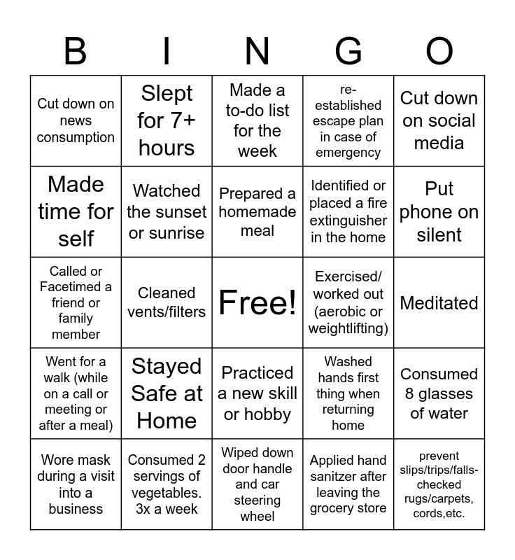 This bingo card has a free space and 24 words: Stayed Safe at Home, Consumed 2 servings of vegetables. 3x a week, Prepared a homemade meal, Wore mask during a visit into a business, Cut down on social media, Cut down on news consumption, Made time for self, Slept for 7+ hours, Exercised/ worked out (aerobic or weightlifting), Practiced a new skill or hobby, Identified or placed a fire extinguisher in the home, Called or Facetimed a friend or family member, Washed hands first thing when returning home, Consumed 8 glasses of water, Watched the sunset or sunrise, Applied hand sanitzer after leaving the grocery store, Meditated, Made a to-do list for the week, Put phone on silent, Cleaned vents/filters, prevent slips/trips/falls- checked rugs/carpets, cords,etc., Went for a walk (while on a call or meeting or after a meal), re-established escape plan in case of emergency and Wiped down door handle and car steering wheel.
