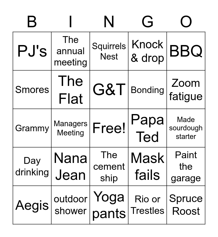 This bingo card has a free space and 24 words: Nana Jean, outdoor shower, G&T, Aegis, BBQ, PJ's, Smores, The annual meeting, Papa Ted, The cement ship, Bonding, Grammy, Mask fails, Paint the garage, The Flat, Rio or Trestles, Made sourdough starter, Squirrels Nest, Zoom fatigue, Managers Meeting, Spruce Roost, Day drinking, Knock & drop and Yoga pants.