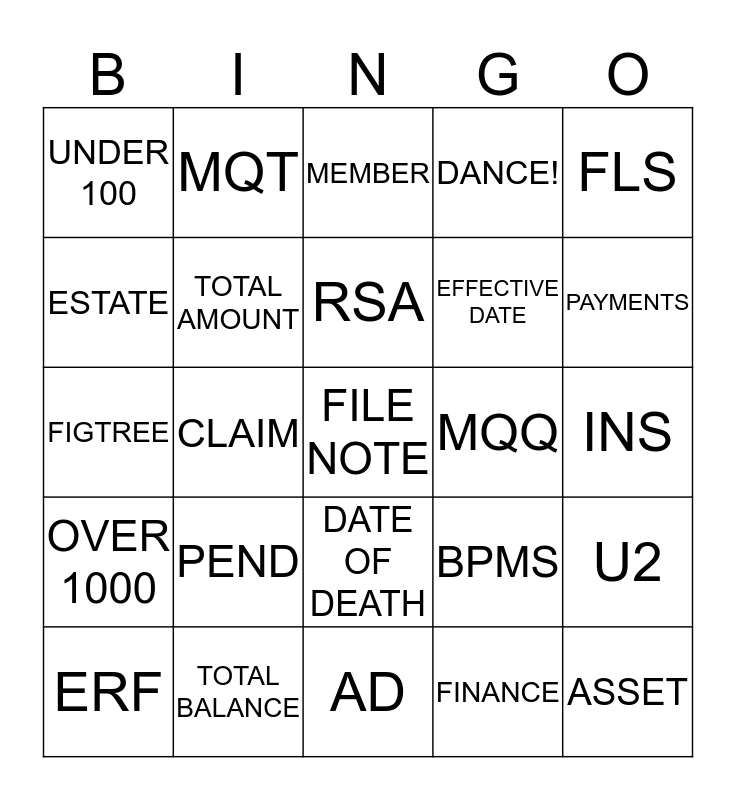 This bingo card has 25 words: PEND, AD, RSA, ERF, FLS, UNDER 100, ESTATE, MQT, MQQ, DATE OF DEATH, EFFECTIVE DATE, FIGTREE, BPMS, U2, TOTAL AMOUNT, ASSET, INS, MEMBER, PAYMENTS, CLAIM, FILE NOTE, TOTAL BALANCE, OVER 1000, DANCE! and FINANCE.