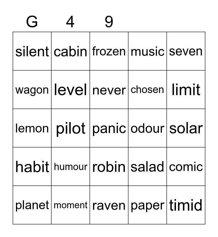 This bingo card has a free space and 24 words: humour, moment, never, planet, seven, silent, wagon, cabin, odour, robin, chosen, lemon, salad, comic, level, paper, solar, frozen, limit, pilot, timid, habit, music and raven.