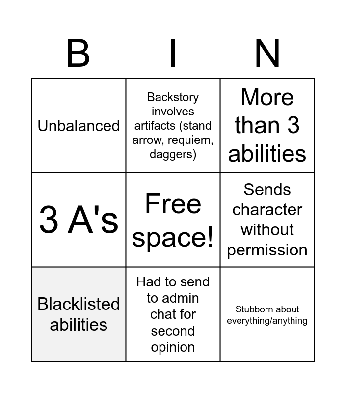 This bingo card has a free space and 8 words: Sends character without permission, More than 3 abilities, Backstory involves artifacts (stand arrow, requiem, daggers), Blacklisted abilities, Unbalanced, Stubborn about everything/anything, 3 A's and Had to send to admin chat for second opinion.