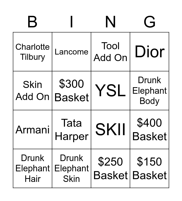 This bingo card has 16 words: Drunk Elephant Skin, $400 Basket, Tool Add On, Charlotte Tilbury, Armani, Lancome, SKII, $250 Basket, Skin Add On, $300 Basket, Drunk Elephant Hair, Dior, Tata Harper, Drunk Elephant Body, YSL and $150 Basket.