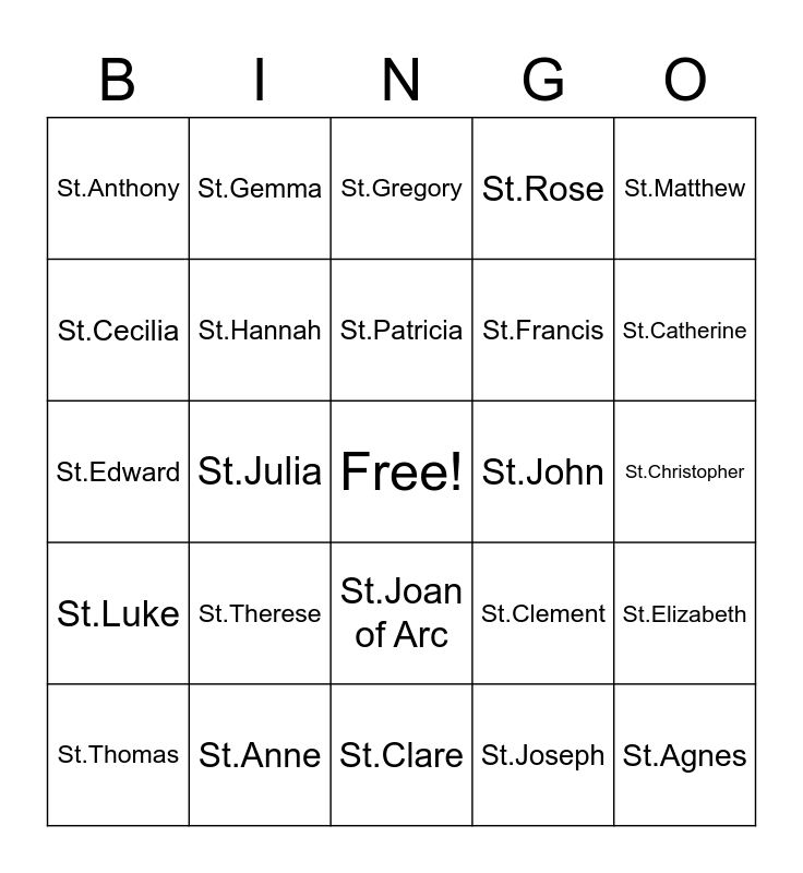 This bingo card has a free space and 24 words: St.Therese, St.Anne, St.Patricia, St.Thomas, St.Matthew, St.Anthony, St.Cecilia, St.Gemma, St.John, St.Joan of Arc, St.Francis, St.Edward, St.Clement, St.Elizabeth, St.Hannah, St.Joseph, St.Christopher, St.Gregory, St.Catherine, St.Julia, St.Agnes, St.Luke, St.Rose and St.Clare.