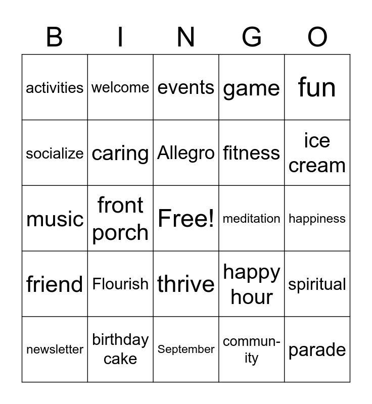 This bingo card has a free space and 25 words: Flourish, September, Allegro, newsletter, fun, activities, socialize, welcome, meditation, thrive, fitness, music, happy hour, spiritual, caring, special, happiness, events, ice cream, front porch, parade, birthday cake, friend, game and commun-ity.