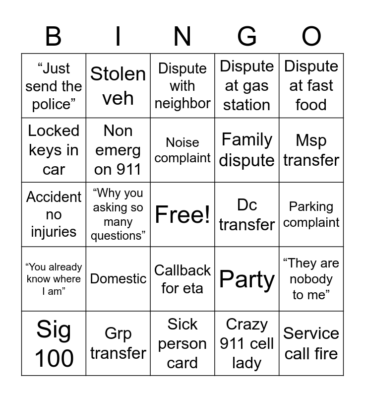 This bingo card has a free space and 24 words: Domestic, Grp transfer, Noise complaint, Sig 100, Dispute at fast food, “Just send the police”, Locked keys in car, Stolen veh, Dc transfer, Callback for eta, Family dispute, Accident no injuries, Party, “They are nobody to me”, Non emerg on 911, Crazy 911 cell lady, Parking complaint, Dispute with neighbor, Msp transfer, “Why you asking so many questions”, Service call fire, “You already know where I am”, Dispute at gas station and Sick person card.