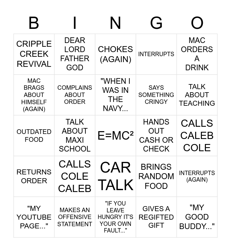 This bingo card has a free space and 37 words: TRIPS, TBN OR CBN TALK, CHOKES, COMPLAINS ABOUT ORDER, INTERRUPTS (AGAIN), CALLS COLE CALEB, "WHEN I WAS IN THE NAVY..., SLURPS OR SMACKS, MAC ORDERS A DRINK, MAC BRAGS ABOUT HIMSELF, TALK ABOUT MAXI SCHOOL, INTERRUPTS, "MY GOOD BUDDY...", CALLS CALEB COLE, MAC BRAGS ABOUT HIMSELF (AGAIN), RETURNS ORDER, HOW'S WORK?, CHOKES (AGAIN), CAR TALK, HANDS OUT CASH OR CHECK, CRIPPLE CREEK REVIVAL, TALK ABOUT TEACHING, "MY YOUTUBE PAGE...", "IF YOU LEAVE HUNGRY IT'S YOUR OWN FAULT...", MISPRONOUNCES SOMETHING, GIVES A REGIFTED GIFT, DEAR LORD FATHER GOD, FALLS ASLEEP WATHING TV, DROPS ANYTHING, FARTS, BURPS, MAKES AN OFFENSIVE STATEMENT, OUTDATED FOOD, OVERCOOKS FOOD, BRINGS RANDOM FOOD, SAYS SOMETHING CRINGY and DONNIE LAUGHS.