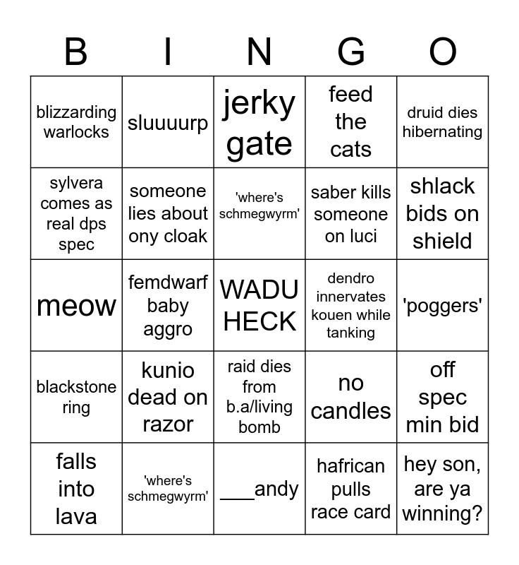 This bingo card has a free space and 24 words: kunio dead on razor, 'where's schmegwyrm', 'where's schmegwyrm', falls into lava, druid dies hibernating, blizzarding warlocks, sylvera comes as real dps spec, sluuuurp, dendro innervates kouen while tanking, raid dies from b.a/living bomb, saber kills someone on luci, meow, no candles, off spec min bid, someone lies about ony cloak, hafrican pulls race card, 'poggers', jerky gate, shlack bids on shield, femdwarf baby aggro, hey son, are ya winning?, blackstone ring, feed the cats and ___andy.