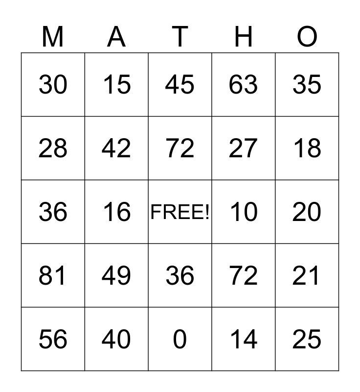 This bingo card has a free space and 24 words: 49, 40, 72, 56, 35, 30, 28, 15, 10, 36, 27, 36, 72, 21, 42, 14, 20, 45, 18, 16, 25, 81, 63 and 0.
