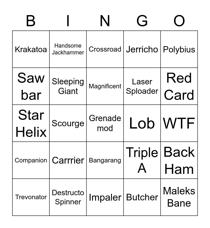 This bingo card has a free space and 24 words: Carrrier, Destructo Spinner, Magnificent, Trevonator, Polybius, Krakatoa, Saw bar, Handsome Jackhammer, Lob, Bangarang, Laser Sploader, Star Helix, Triple A, Back Ham, Sleeping Giant, Butcher, WTF, Crossroad, Red Card, Scourge, Maleks Bane, Companion, Jerricho and Impaler.