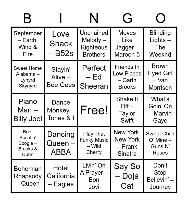This bingo card has a free space and 47 words: Uptown Funk – Mark Ronson, Don’t Stop Believin’ – Journey, Sweet Caroline – Neil Diamond, Livin’ On A Prayer – Bon Jovi, Dancing Queen – ABBA, Footloose – Kenny Loggins, Love Shack – B52s, Celebration – Kool & The Gang, Sweet Home Alabama – Lynyrd Skynyrd, Billie Jean – Michael Jackson, Stayin’ Alive – Bee Gees, Moves Like Jagger – Maroon 5, Sweet Child O’ Mine – Guns N’ Roses, New York, New York – Frank Sinatra, What A Wonderful World – Louis Armstrong, Despacito – Luis Fonsi, Daddy Yankee, Justin Bieber, Perfect – Ed Sheeran, Shake It Off – Taylor Swift, Girls Just Wanna Have Fun – Cyndi Lauper, Blinding Lights – The Weeknd, Dance Monkey – Tones & I, Say So – Doja Cat, September – Earth, Wind & Fire, Friends In Low Places – Garth Brooks, I Wanna Dance With Somebody – Whitney Houston, Brown Eyed Girl – Van Morrison, Bohemian Rhapsody – Queen, Can’t Help Falling In Love – Elvis Presley, Play That Funky Music – Wild Cherry, Boot Scootin’ Boogie – Brooks & Dunn, I’ve Had The Time Of My Life – Bill Medley & Jennifer Warnes, Macarena – Los Del Rio (Bayside Boys Remix), Chicken Fried – Zac Brown Band, At Last – Etta James, Imagine – John Lennon, Hotel California – Eagles, What’s Goin’ On – Marvin Gaye, One Love – Bob Marley, Havana – Camila Cabello, Thriller – Michael Jackson, Cotton Eye Joe – Rednex, Unchained Melody – Righteous Brothers, Piano Man – Billy Joel, Old Town Road – Lil Nas X ft. Billy Rae Cyrus, Wannabe – Spice Girls, Mambo No. 5 – Lou Bega and Pretty Woman – Roy Orbison.
