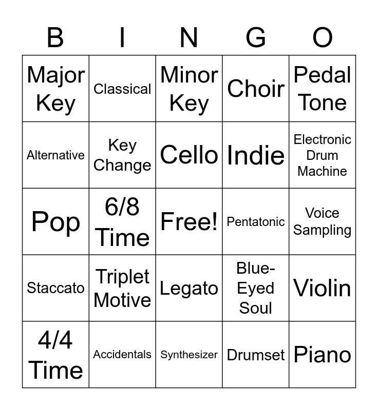 This bingo card has a free space and 29 words: 4/4 Time, 3/4 Time, 6/8 Time, 12/8 Time, Major Key, Minor Key, Key Change, Triplet Motive, Pentatonic, Accidentals, Voice Sampling, Piano, Synthesizer, Drumset, Electronic Drum Machine, Arpeggio, Legato, Staccato, Pedal Tone, Pop, Blue-Eyed Soul, Rock, Indie, Alternative, Choir, Classical, Violin, Cello and Harpsichord.