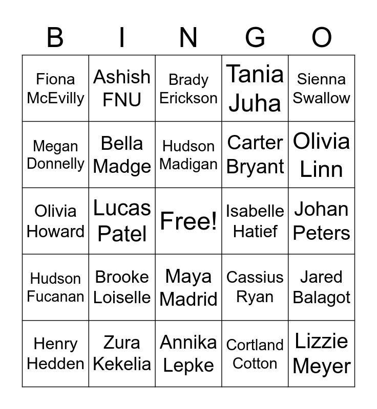 This bingo card has a free space and 28 words: Jared Balagot, Abby Barrere, Carter Bryant, Cortland Cotton, Megan Donnelly, Brady Erickson, Ashish FNU, Hudson Fucanan, Isabelle Hatief, Henry Hedden, Olivia Howard, Tania Juha, Zura Kekelia, Annika Lepke, Olivia Linn, Anson Liptak, Brooke Loiselle, Bella Madge, Hudson Madigan, Maya Madrid, Fiona McEvilly, Ben Meierding, Lizzie Meyer, Lucas Patel, Johan Peters, Cassius Ryan, Sienna Swallow and Alexis Vafai.
