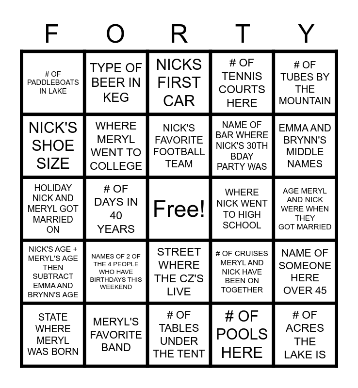 This bingo card has a free space and 24 words: NAMES OF 2 OF THE 4 PEOPLE WHO HAVE BIRTHDAYS THIS WEEKEND, MERYL'S FAVORITE BAND, NICK'S FAVORITE FOOTBALL TEAM, STATE WHERE MERYL WAS BORN, # OF TUBES BY THE MOUNTAIN, # OF PADDLEBOATS IN LAKE, NICK'S SHOE SIZE, TYPE OF BEER IN KEG, WHERE NICK WENT TO HIGH SCHOOL, STREET WHERE THE CZ'S LIVE, NAME OF BAR WHERE NICK'S 30TH BDAY PARTY WAS, HOLIDAY NICK AND MERYL GOT MARRIED ON, # OF CRUISES MERYL AND NICK HAVE BEEN ON TOGETHER, NAME OF SOMEONE HERE OVER 45, WHERE MERYL WENT TO COLLEGE, # OF POOLS HERE, AGE MERYL AND NICK WERE WHEN THEY GOT MARRIED, NICKS FIRST CAR, EMMA AND BRYNN'S MIDDLE NAMES, # OF DAYS IN 40 YEARS, # OF ACRES THE LAKE IS, NICK'S AGE + MERYL'S AGE THEN SUBTRACT EMMA AND BRYNN'S AGE, # OF TENNIS COURTS HERE and # OF TABLES UNDER THE TENT.