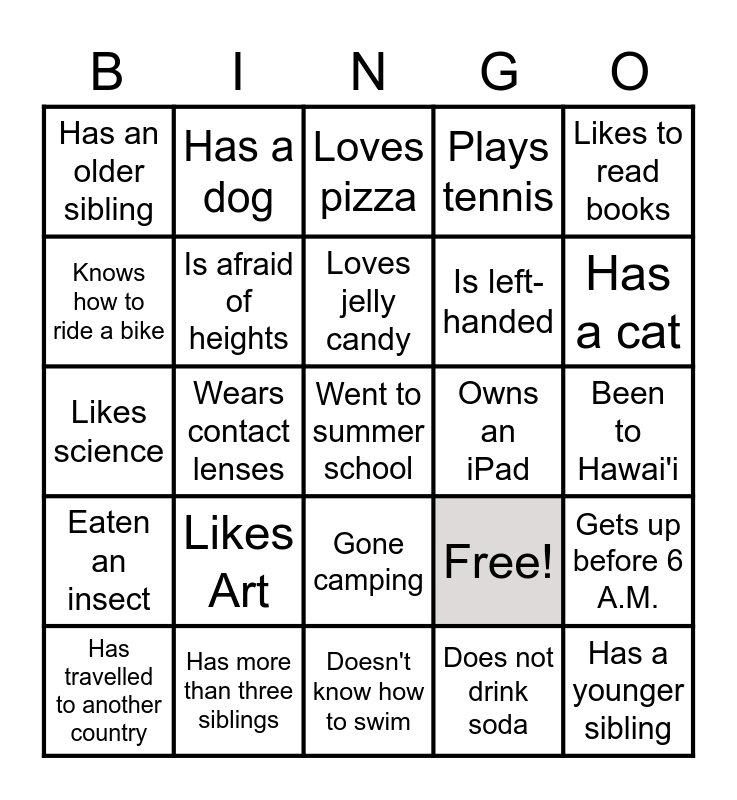 This bingo card has 25 words: Likes Art, Doesn't know how to swim, Loves jelly candy, Has travelled to another country, Likes to read books, Has an older sibling, Knows how to ride a bike, Has a dog, Owns an iPad, Gone camping, Is left-handed, Likes science, Free!, Gets up before 6 A.M., Is afraid of heights, Has a younger sibling, Been to Hawai'i, Loves pizza, Has a cat, Wears contact lenses, Went to summer school, Has more than three siblings, Eaten an insect, Plays tennis and Does not drink soda.