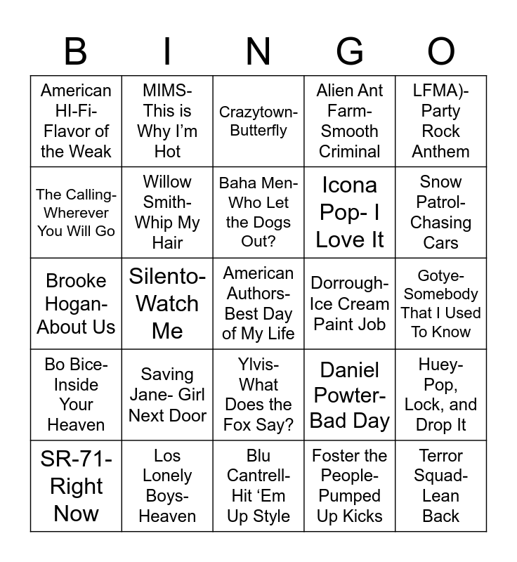 This bingo card has 27 words: Daniel Powter- Bad Day, Terror Squad- Lean Back, Icona Pop- I Love It, Blu Cantrell- Hit ‘Em Up Style, The Calling- Wherever You Will Go, Crazytown- Butterfly, MIMS- This is Why I’m Hot, Bo Bice- Inside Your Heaven, Dorrough- Ice Cream Paint Job, Huey- Pop, Lock, and Drop It, Brooke Hogan- About Us, Alien Ant Farm- Smooth Criminal, SR-71- Right Now, Los Lonely Boys- Heaven, Snow Patrol- Chasing Cars, Afroman- Because I Got High, Willow Smith- Whip My Hair, Baha Men- Who Let the Dogs Out?, Saving Jane- Girl Next Door, American HI-Fi- Flavor of the Weak, Gotye- Somebody That I Used To Know, Foster the People- Pumped Up Kicks, Silento- Watch Me, American Authors- Best Day of My Life, Ylvis- What Does the Fox Say?, LFMA)- Party Rock Anthem and Shop Boyz- Party Like A Rockstar.