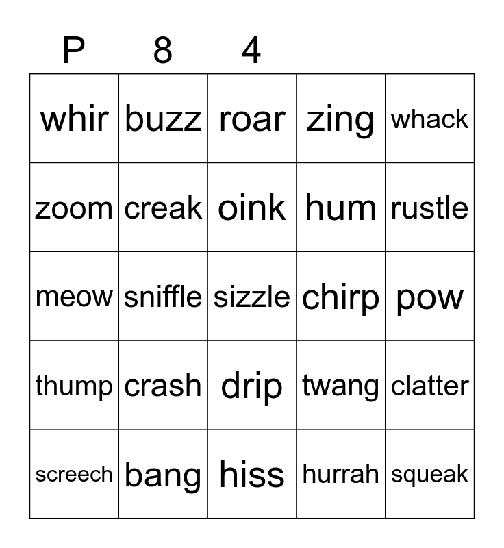 This bingo card has a free space and 24 words: crash, bang, oink, screech, whack, whir, zoom, buzz, chirp, drip, hum, meow, twang, clatter, creak, hurrah, pow, roar, rustle, sniffle, squeak, thump, zing and hiss.