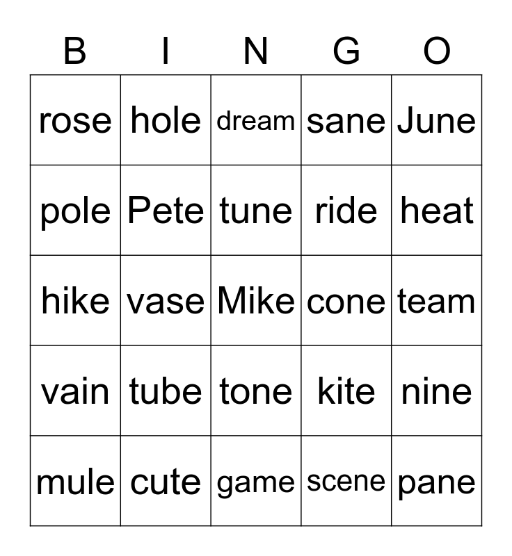 This bingo card has a free space and 24 words: tube, cute, tune, mule, June, rose, pole, hole, cone, tone, ride, hike, kite, nine, Pete, scene, team, dream, heat, vase, pane, vain, sane and game.