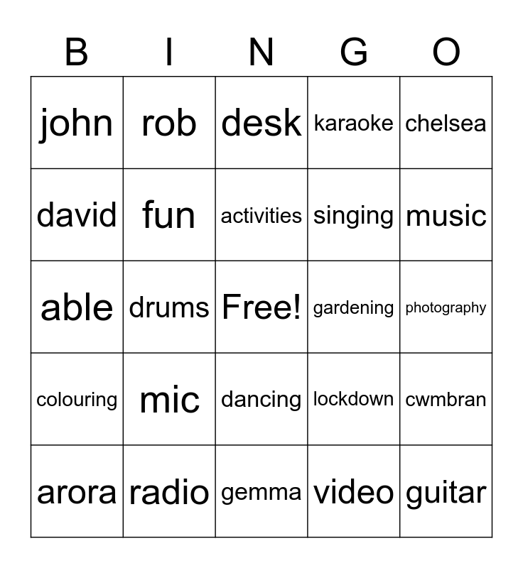 This bingo card has a free space and 24 words: mic, radio, activities, arora, chelsea, john, david, rob, gardening, dancing, singing, able, lockdown, cwmbran, fun, video, photography, desk, music, drums, guitar, colouring, karaoke and gemma.